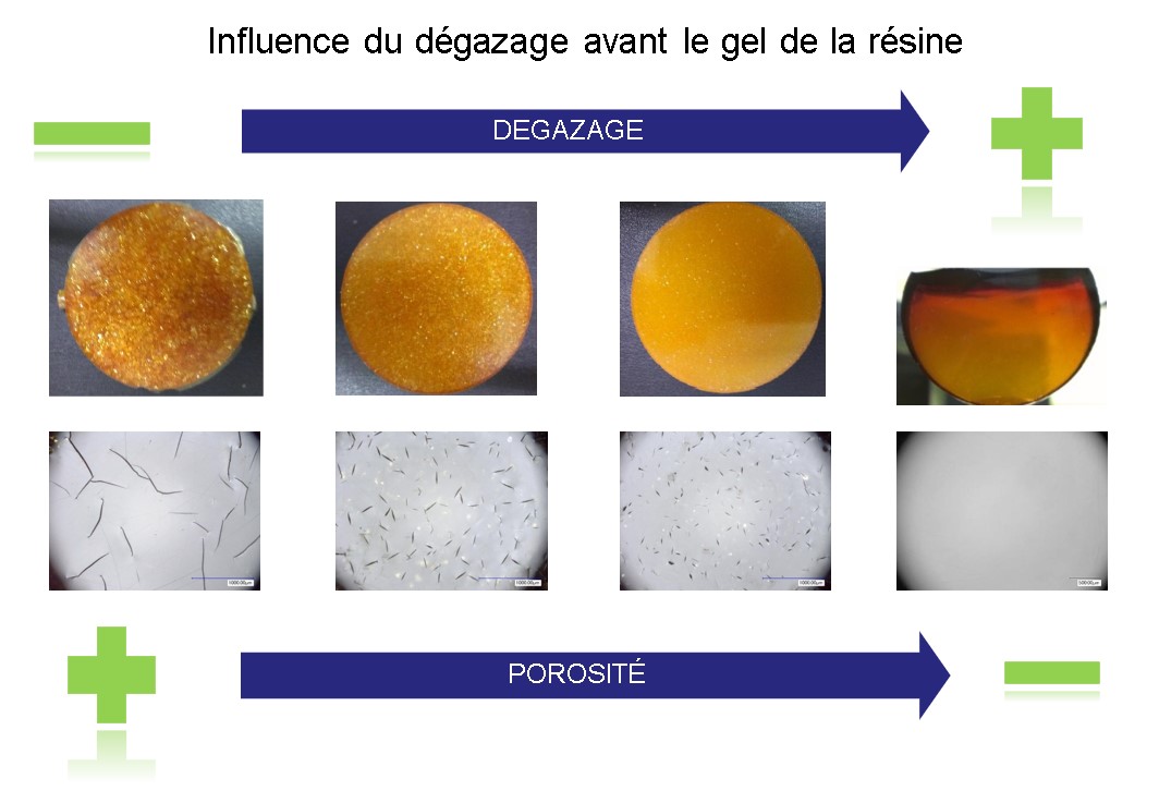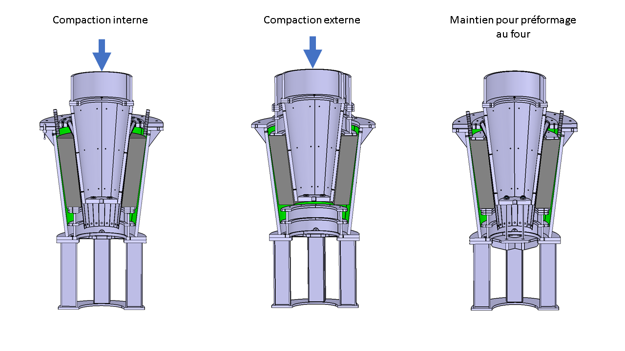Pour comprendre les paramètres en jeu, plusieurs études préalables ont été nécessaires. Premièrement, en réponse au problème de flambage des fibres, l’inversion du sens d’application de la pression pour tendre les fibres circonférentielles plutôt que pour les compresser apparaissait évidente, seulement l’atteinte de l’objectif de compaction sans blocage et rupture des fibres circonférentielles représentait une incertitude importante. Pour étudier la compaction sous déformation interne des renforts et les limitations, un outil a été conçu. Cet outil avait aussi pour fonction de réaliser le préformage (formage avant moulage) des fibres afin de séparer les étapes de compaction et de moulage pour mieux maîtriser le taux de fibre et la forme finale de la pièce. Deuxièmement, l’obtention d’un taux de porosité ouverte contrôlé nécessitait une étude importante pour identifier et comprendre des paramètres qui l’influence. Des essais en DSC et des fabrications à l’intérieur d’un moule vitré ont permis de comprendre le phénomène d’apparition de porosités dans la résine et d’établir la relation liant la longueur de l’étape de dégazage, paramètre le plus influent, avec le taux de porosité.