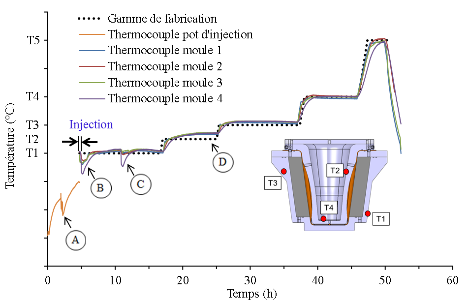 En parallèle, plusieurs autres études ont eu lieu pour définir les paramètres de moulage : 1. Étude rhéologique de la résine, 2. Étude de perméabilité et de compaction plane du renfort. 3. Étude de compatibilité chimique de la résine, de l’agent démoulant et de la membrane élastomère (paroi flexible) utilisée dans le procédé. 4. Étude de corrosion et de traitement de surface pour le moule. 5. Étude du comportement sous haute pression et température des membranes élastomère. À la suite des études préliminaires, la conception du moule et du cycle de fabrication a été réalisée à l’aide de la simulation numérique de l’écoulement à l’intérieur du moule, de la simulation thermique de la polymérisation et de la validation du cycle de fabrication sur des plaques minces.