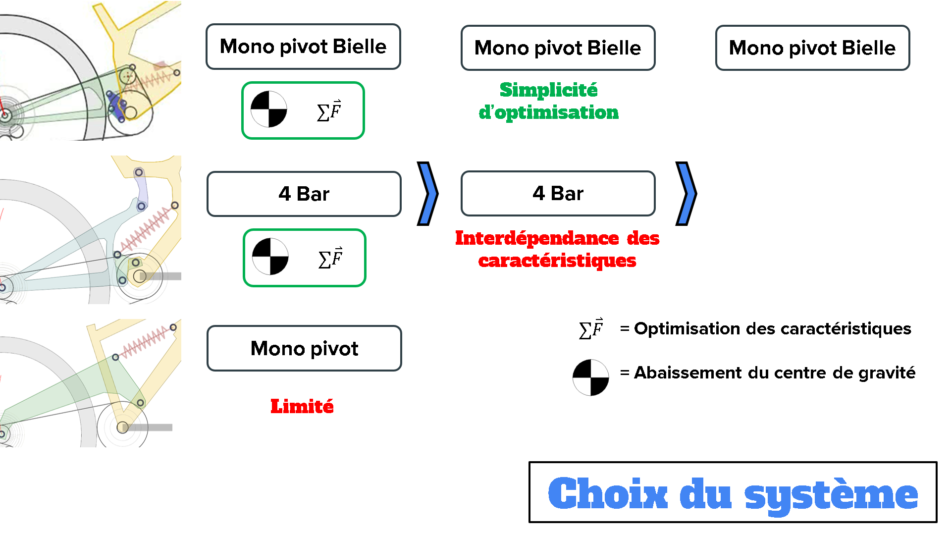 Sans avoir révolutionné le domaine, le vélo conçu comporte tout de même plusieurs caractéristiques distinctives et remarquables : 1. Un pivot haut, permettant une trajectoire de roue vers l’arrière pour une diminution des forces maximales horizontales transmises au cycliste, concept qui en 2014 (année de fin de la conception) n’avait pas encore été utilisé à grande échelle. 2. Une roulette folle avec nombre de dents variable sur le brin tendu de la chaine permettant d’obtenir une perte d’énergie minimale dans la suspension arrière au pédalage tout en étant ajustable en fonction du poids et du style du cycliste. 3. Une courbe de suspension propositionnelle autour de la position d’équilibre et progressive en fin de course permettant une absorption optimale des petites à moyennes perturbations et un comportement prévisible sans blocage en fin de course. 4. Le placement de toutes les composantes du système de suspension très bas et près du centre de masse du cadre contribuant à sa maniabilité. 5. Un design attirant, caractéristique primordial pour cette industrie. Depuis 2014, plusieurs compagnies de vélo reconnues ont convergé vers des solutions très similaires aux nôtres : Commencal (2016), Norco bicycle (2018), Gt bicycle (2018), Cycle Devinci (prototype en test, 2020) entre autres. Les compagnies de vélo ont depuis compris l’importance de la recherche et de la validation expérimentale, les vélos de montagne d’aujourd’hui étant beaucoup plus fiables et optimisés qu’autrefois.