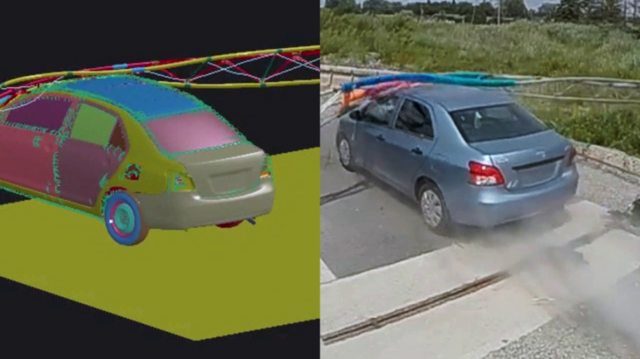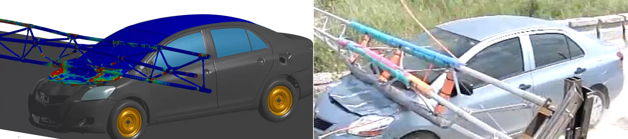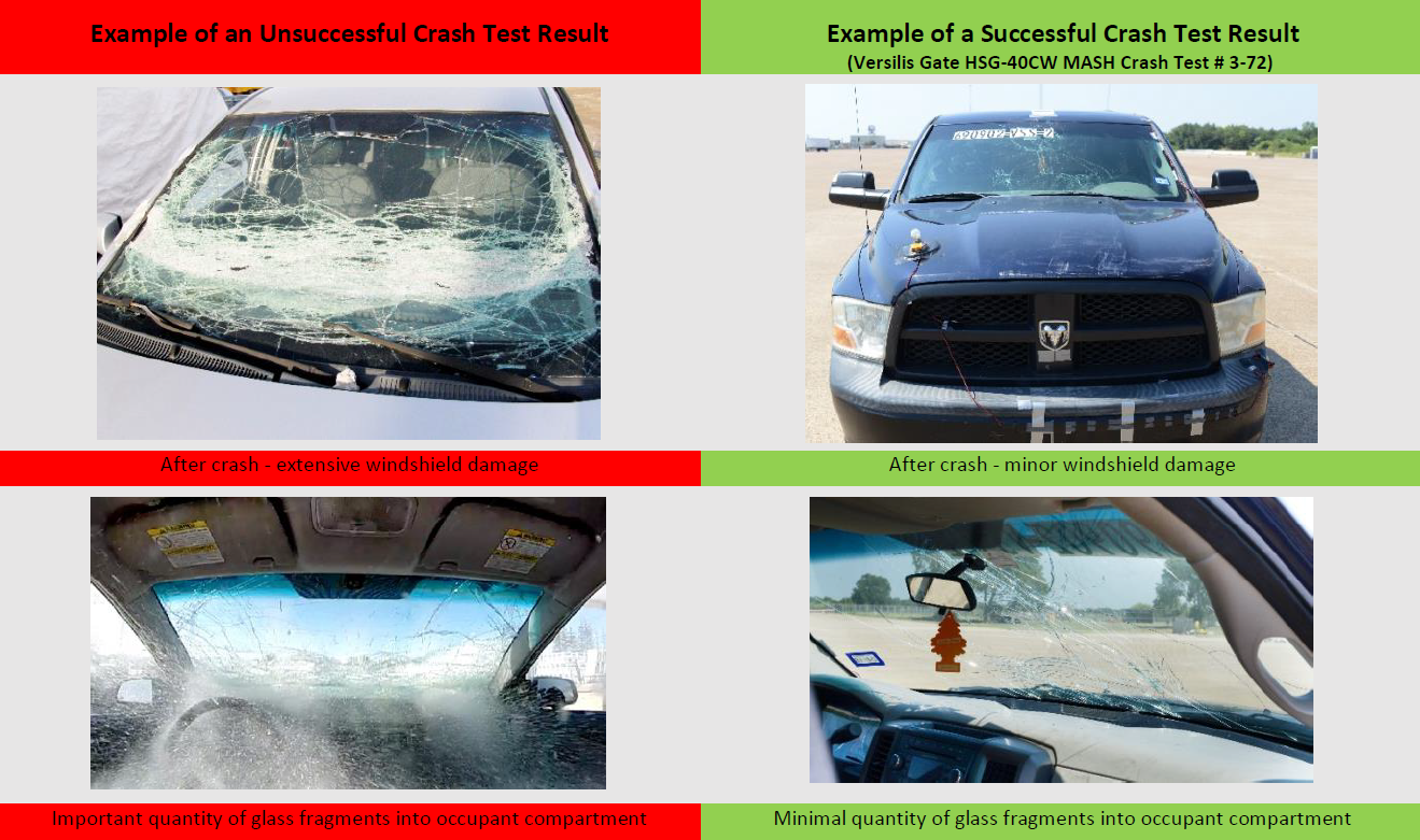 Le comportement à l’impact des véhicules dans des barrières représentait l’incertitude principale du projet. Dans les premiers mois du projet, les essais ont montré que l’approche qui avait été adoptée pour le premier produit ne pourrait pas être réutilisée. Une stratégie complétement différente a été développée. Le produit final répond à toutes les normes et en particulier la nouvelle norme de sécurité routière américaine MASH-2016, il couvre des longueurs de barrières de 1.2 à 12.2 m (4 à 40 pi) et il possède une visibilité hors du commun. Plusieurs autres concepts ont été inclus au produit pour le positionner dans une classe à part : 1. Le système est totalement récupérable après l’impact d’un véhicule de promenade à 100 km/h. 2. La structure intègre une base affaiblie permettant d’aller au-delà des normes pour sécuriser l’impact de plus gros véhicules dans le système. 3. Le système est transportable sur palette de 1.2 X 2.4 m (4 X 8 pi) et les connexions structurelles s’assemblent manuellement en quelques secondes et ne possèdent aucun jeu. 4. L’actionnement contrôlé en couple permet de limiter les problèmes en cas d’ouverture par grand vent ou avec une obstruction de la voie. Ce système unique au monde commence déjà à redéfinir l’industrie.